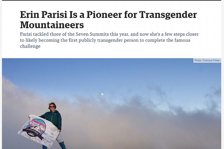 Erin Parisi Is a Pioneer for Transgender Mountaineers by Katie Coakley / Read the Original Article Here Erin Parisi’s trek up Mount Kilimanjaro last March wasn’t easy. Recovering from food poisoning and contending with almost continuous rainfall and the aches and fatigue that accompany six days of climbing, she tried to maintain a positive attitude…